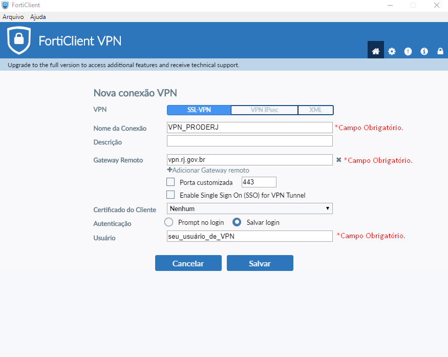 Preencha:- Nome da Conexão: VPN_PRODERJ